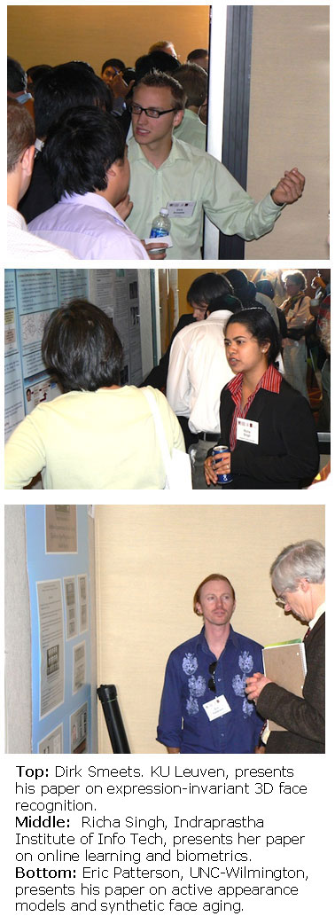 Following a tradition started last year, conference attendees voted for Best Poster Paper awards. There was a tie for Monday's winner, with attendees selecting both "Isometric Deformation Modeling Using Singular Value Decomposition for 3D Expression-Invariant Face Recognition" by Dirk Smeets, Thomas Fabry, Jeroen Hermans, Dirk Vandermeulen and Paul Suetens from Katholieke Universiteit Leuven, and "Improvements in Active Appearance Model Based Synthetic Age Progression for Adult Aging" by Eric Patterson, Amrutha Sethuram, Karl Ricanek and Frederick Bingham from UNC – Wilmington. On Tuesday, attendees selected "Biometric Fusion: Does Modeling Correlation Really Matter?" by Karthik Nandakumar from the Institute for Infocomm Research, Arun Ross from West Virginia University and Anil Jain from Michigan State University. On Wednesday, the winner was "Online Learning and Biometrics: A Case Study In Face Classifier Update" by Richa Singh and Mayank Vatsa from the Indraprastha Institute of Information Technology in Delhi, and Arun Ross and Afzel Noore from West Virginia University. This year's conference featured three excellent invited speakers. Monday's invited talk, titled "Forensic DNA Typing", was given by Dr. Peter Vallone from the National Institute of Standards and Technology. Tuesday's talk, "Digital Tampering and Forensics", was given by Dr. Hany Farid from Dartmouth. Wednesday's talk, "Insights from the Intersection of Psychological and Computational Approaches to Face and Body Biometrics", was given by Dr. Alice O'Toole from the University of Texas at Dallas. Each of the invited speakers did a great job. The proceedings does not contain papers corresponding to these talks, but check the conference web site for an electronic copy of the speakers' slides. There were two panel discussions this year. One had the theme "Spoof and Counter-Spoof: Will Your Doppelganger Break the System?" and the panelists were Stephanie Schuckers (Clarkson University), Arun Ross (West Virginia University), Rob Rowe (Lumidigm) and Phil Quick (Cognitec). The second panel had the theme "What Good Are Quality Metrics, Anyway?" and the panelists were Patrick Grother (National Institute of Standards and Technology), Krzysztof Kryszczuk (IBM Zurich Research Lab) and Austin Hicklin (Noblis). The number of papers submitted to BTAS has grown by 10% or more each year, reaching 139 this year. As the number of submissions has grown, the program committee size has also grown, and the conference has kept its "big tent" approach to the allowed scope. This means that the task that confronts the Program Chairs has become increasingly complex. Mark Nixon and Nalini Ratha did a masterful job as Program Co-Chairs, managing the submission, reviewing, and decision process, and constructing the conference program. Patrick Flynn served as Publications Chair again, managing the process of getting the final versions of the papers in, producing the proceedings and getting papers into IEEE Xplore. The proceedings was given to attendees this year as a memory stick / laser pointer / pen combination. BTAS 09 was co-sponsored by the IEEE Systems, Man & Cybernetics Society and the new IEEE Biometrics Council. The Biometrics Council became a co-sponsor this year and is expected to continue to play an important role in future BTAS conferences. |
